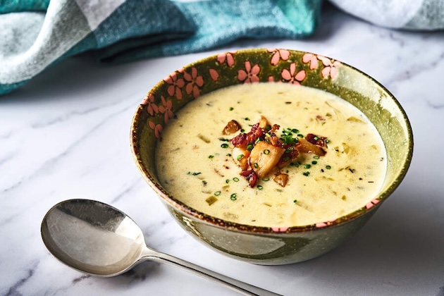 Ladle the hot chowder into warm bowls and top with the fried scallop and bacon before sprinkling with chives.